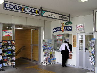 | 駅舎内、改札口。改札ブースはなく、駅員が外へ出て改集札を行います。券売機、出札窓口もこの辺りにあります。 | 駅舎内には北越急行の「営業開発部」があり、よろず窓口「ほっくほく案内所」があります。レンタカーの窓口にもなっています。 | |||||||||||||||||||