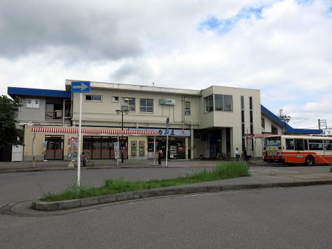| 古い橋上駅舎です。こちらは正面に当たる南口。前面にエレベーターが増設されています。1階は飲食店。紅白のテントに見えるものは手前にあるバス停です。(H26.7撮影) |