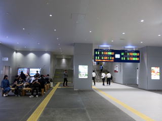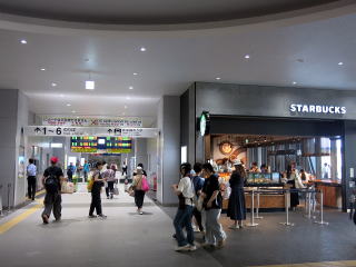 在来改札口。入口手前にスターバックスがあります。 | 改札内コンコース。奥の階段を上がるとホームですが、その手前にも待合コーナーが左右にあります。 | ||||||||||||||||||||||||