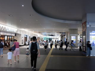 駅舎入口。駅舎のこの外壁は熊本城の「武者返し」をモチーフとしているとか。 | 駅舎内。右手に改札や窓口があります。左手は「肥後よかモン市場」という商業施設です。 | ||||||||||||||||||||||||