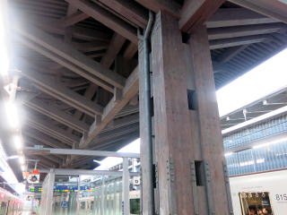 4・6番ホームの下り方にある切り欠きホームは三角線乗り場の5番ホームです。2番ホームも1・3番の下り方にある切り欠きホームで、珍しい2面6線構内は島式+切り欠きホームが2面という構成です。 | ホームの支柱、上屋は熊本城をイメージしたものでしょう。太い梁に鉄の鋲が打たれた、城郭建築のような仕上げです。 | ||||||||||||||||||||||||