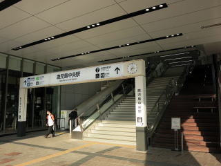 駅舎の右手には大観覧車が目を引くJR九州の商業施設「アミュプラザ鹿児島」があり、駅舎と接続しています。またアミュプラザとの間の屋外には大屋根のかかる屋外広場があります。 | 駅舎入口。内照式のアーチがあり、右脇に休憩可の階段があります。また駅舎竣工後、2階コンコースへ直結するペディストリアンデッキの入口も開設されています。 | ||||||||||||||||||||||||