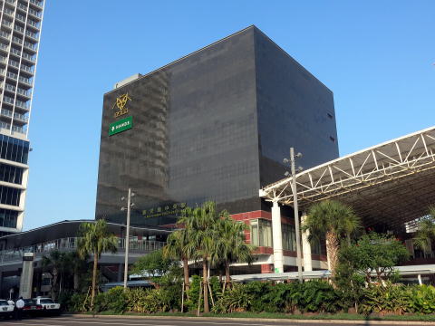窓が全くないように見える、巨大な黒御影石のモニュメントのような異形の駅舎。8階建の「アミュプラザ鹿児島プレミアム館」という、平成26年築の駅ビルです。駅舎自体はこの奥にあり、改札が2階にある橋上駅舎です。この駅舎は構内西側で「桜島口」です。(R7.8撮影) |