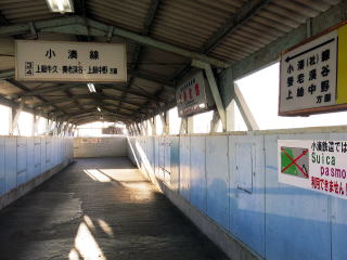 | こちらはJR構内からの連絡跨線橋。中間改札の代わりにこのJR側の入口にSuicaリーダーがあります。 | 小湊鉄道ホームは1面1線。非電化線で、JRホーム連番の3番が充てられます。実際は両面ホームですが片面は旅客用に使用していません。 | |||||||||||||||||||