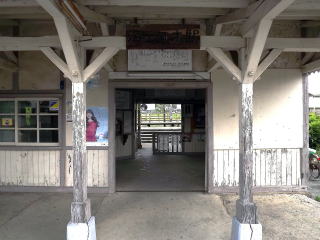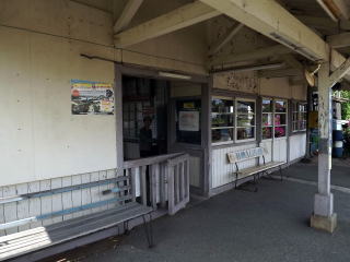 | 軒下にある駅舎入口。手前に木製駅名板があり、駅名板が通常ある入口上部には名所案内板があります。 | 駅舎内。窓口がありますが、この訪問の2か月前に閉鎖され、無人化されました。券売機が入っています。 | ||||||||||||||||