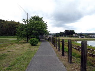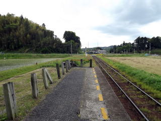 | ホーム待合室の内部。つくり付けの木製ベンチがあります。大型で側面にも窓があります。 | 駅は田畑地帯の只中にあります。駅入口からホームにもあるこの木の杭が何とも素朴で良い感じです。 | ||||||||||||||||