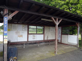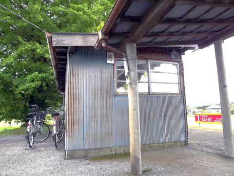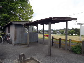 | 駅舎のない駅です。ホームの中央に半オープンの大型の待合室があり、その側面に木製の駅名板があります、が手前に上屋があることもあり、全く目立ちません。(H25.5撮影) |
