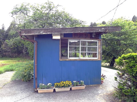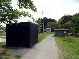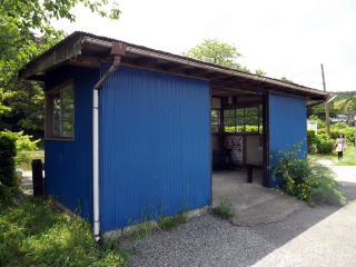 | おそらく駅の正式入口はこちら。待合室の背面側で、上の画像で左側に回った図。こちらに駅名板があれば駅舎然とするのですが。 | 駅の入口。車はおそらく通れない程度の舗装路があります。左手前は新しい多目的トイレです。突き当たりが駅です。 | ||||||||||||||||