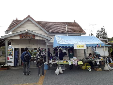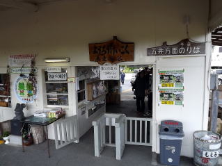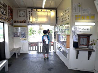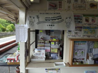 | 駅舎内。有人駅です。手前の小さな窓口は使用していないようですが、出札は行なっています。 | 改札脇に売店を兼ねた窓口があります。売店ではオリジナルグッズを販売しています。 | ||||||||||||||||