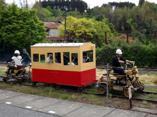 | 対向ホーム跡の廃ホームがあります。レールも残されています。 | 残された副本線では自転車型の足こぎトロッコを運行させています。常設ではないようです。 | ||||||||||||||||