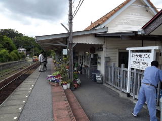 | 駅名のとおりハイキングコースとして人気の養老渓谷下車駅。観光駅ではありますが、駅周囲は小さな集落で、廃商店と思しき店舗跡が散見され、かつては賑やかであったであろう形跡が見られます。 |