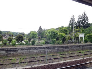 | 駅前は大きな広みがあり、大きなロータリーとその脇に駐車場が整備されていました。現在は駐車場を含む駅前の一部を緑化した「逆開発」が行なわれています。 | 駅舎に並んで足湯が整備されています。付近に温泉街があるわけではないのですが。 | ||||||||||||||||