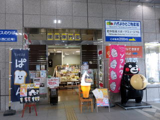 駅舎内に商業施設はありませんが、キヨスクのほか、ハチミツ専門店が入っています。もちろんくまモンがお出迎え。抱えているのは尺玉花火です。 |