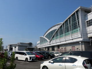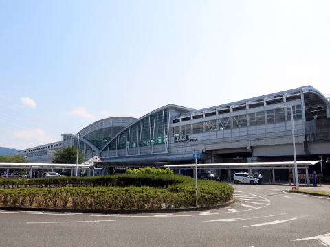 こちらは南口。こちらの駅舎前には新幹線高架に直交する在来線の駅舎があります。新幹線駅前にロータリーはなく、カーシェア用を含めた駐車場となっています。 |
