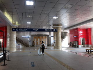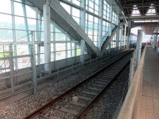 12番ホームは両面ホームで、かつて在来リレー特急が入線していた旧11番線が残っています。乗り場には柵が設置されています。上り待避線に改修する計画もあるようです。 |