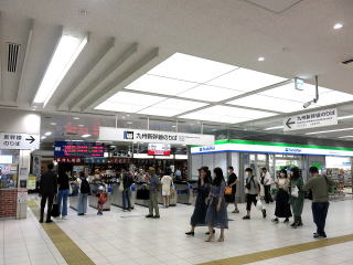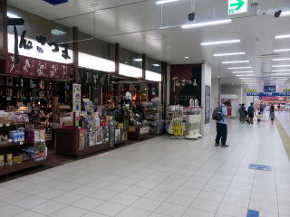 改札内の通路。大きな土産物屋がありますが、焼酎などの酒類主体のようでした。 | 改札内コンコース。錯視を利用した案内標示があります。 | ||||||||||||||||||||||