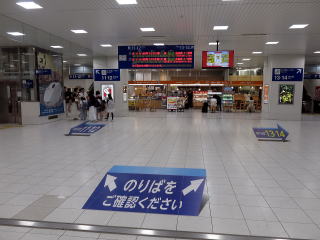 駅舎内1階に大きな木。「出会い杉」という待ち合わせ場所です。 | 改札は2階にあります。新幹線改札前のコンコース。在来改札もこの左に並んであります。 | ||||||||||||||||||||||