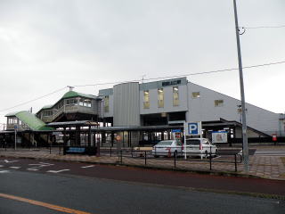 駅舎入口。誘導看板には社章ではなく町のキャラクターが書かれています。 | 裏手口にあたる南。裏手の分スペースがあり、駐車場・駐輪場はこちらにあります。 | |||||||||||||||||||