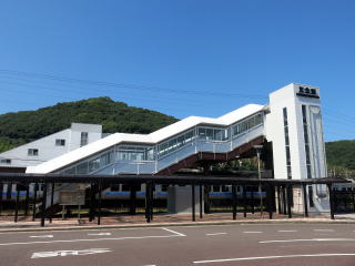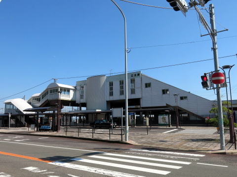 平成15年に改築された橋上駅舎。平成二桁の築としては特に意匠性のない無機質な形状です。入口はテント屋根の階段は駅舎入口の自由通路です。(R7.8撮影) |
