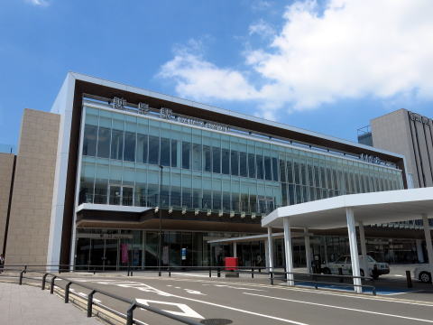 前面ガラス張りで直線基調の特徴的な駅舎。新幹線開業前の平成30年の改築です。こちらは正面口にあたる東口で、右手に接続するのは商業施設兼ホテル。駅前にはバスターミナルのあるロータリーがあります。(R7.8撮影) |