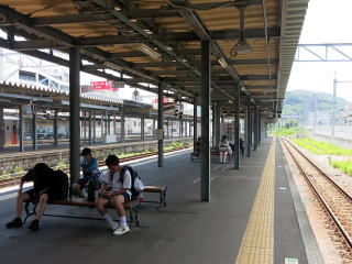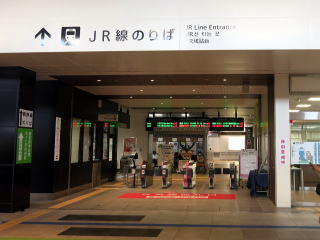 駅舎内。自由通路兼コンコース。右手に窓口、在来改札、駅事務室、新幹線改札、券売機、待合室と並んでいます。 | 在来改札口。左手に駅事務室があり、その裏に新幹線との乗り換え改札があります。 | ||||||||||||||||||||||||