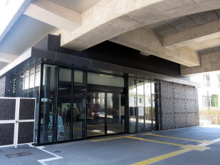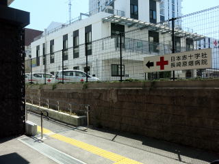 駅入口。高架の下が入口となっています。 | 高架の裏手側にはすぐに日赤病院があり、細々とした裏口があります。高架下の駅向かいには調剤薬局が入っています。 | |||||||||||||||||||||