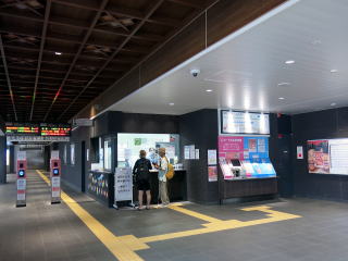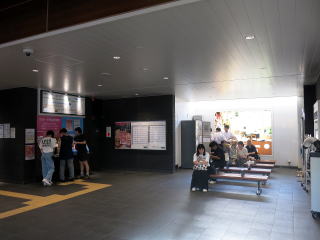 駅舎内。みどりの窓口が営業しています。改札は改札機ではなくICカートリーダーです。 | 駅舎内には待合室や売店はありません。待合コーナーにベンチが並びます。 | |||||||||||||||||||||