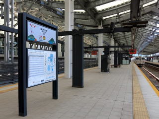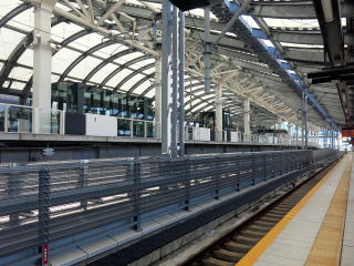 構内は新幹線ホームと一体化した上屋がかかります。奥の一段高いのが新幹線ホームです。上屋は明かりを通す材質のため構内は明るいです。 |