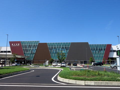 三角形のガラスと台形を組み合わせたようなデザインの駅舎。階段状に高さをずらすなど意匠を凝らしています。こちらは正面側にあたる「さくら口(東口)」。駅前のロータリーは路線バスが入ります。(R7.8撮影) |