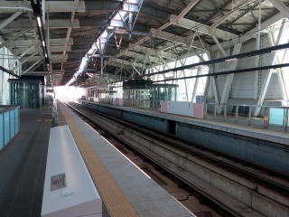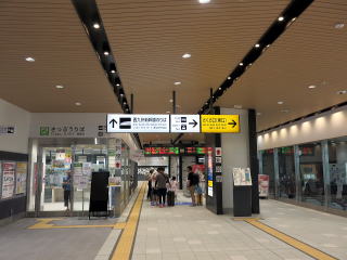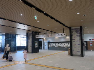 駅入口には鉄骨でトラスを組んだ大きなキャノピーがかかります。駅入口は右手で、左手の白い区画は観光案内所です。 | こちらは「さざなみ口(西口)」東口と同じ意匠で、こちら側は住宅街です。西口とは言っても手前に在来線が通るため入口はなく、地下道自由通路を介して東口が入口となります。 | |||||||||||||||||||