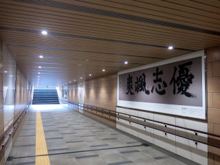 駅の東西を結ぶ地下道自由通路「大村みらい通り」。大きな書は地元の書家により駅開業イベント時に書かれたものです。 | 駅舎内。在来線は駅舎から外れるためコンパクトです。左手に券売機・窓口、左手に待合室があり、正面が改札口です。 | |||||||||||||||||||