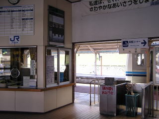 中間主要駅らしく沿線で最も貫禄のある大型の木造駅舎です。左手に職員詰所や、以前は旅行センターも併設していましたが、空きテナントとなっています。(H25.4撮影) |