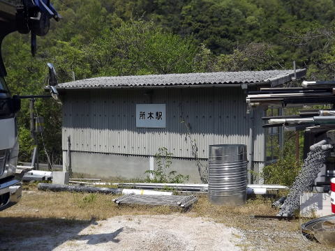 駅舎はありません。ホーム待合室の背に駅名表示がありますが、工務店の庭先に面しており、埋もれてしまっているような佇まい。公道から撮っています。(H19.5撮影) |