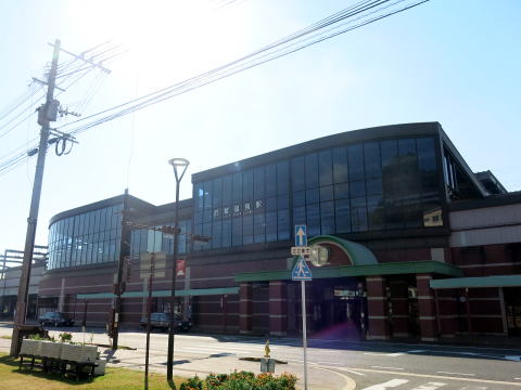 平成21年に竣工したガラス面の大きな高架駅舎。こちらは北口にあたる楼門口です。駅前は直接旧国道に面し、駅前のロータリーなどは道路向かいに小さくあります。(R7.8撮影) |
