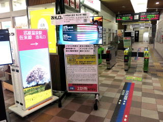 物産販売所の一部は広い待合所となっています。一部テーブルもあります。 | キヨスクと窓口跡の間が改札口です。ただし特急でも通常の特急と新幹線リレー特急で改札が異なるため案内も細かく出ています。 | |||||||||||||||||||