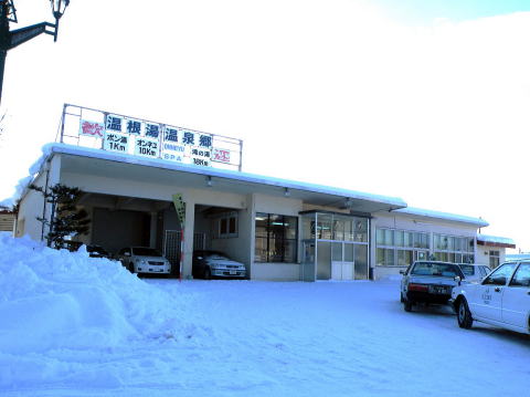 コンクjリート造平屋建ての駅舎。屋上の一番目立つ看板は駅名表示ではなく、温根湯温泉郷の案内看板です。駅名表示は入口脇に小さくあります。(H24.1撮影) |