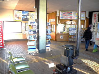 駅舎内。無骨な外観の駅舎ですが、窓口回りに木を多用し暖かい雰囲気です。窓口脇が改札口です。 | 駅舎はホームに接していません。改札を通り右へ向かえば1番のりば、左の跨線橋へ向かえば2・3番乗り場です。 | ||||||||||||||||