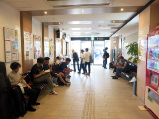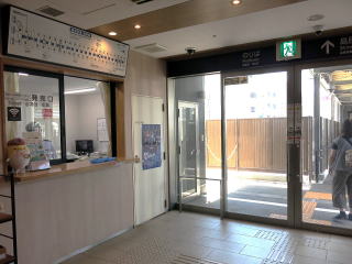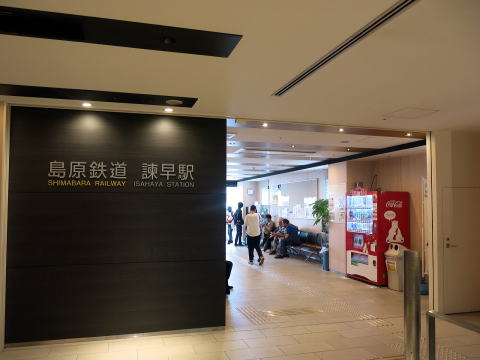 島原鉄道用のコンコース。通路兼待合で、両側にソファが並びます。 | 出札窓口があります。この左に1台券売機があります。改札は右のガラス戸です。 | |||||||||||||||||||||