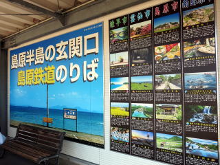 ホームは1面1線。行き止まり式です。駅舎寄りに乗り口があるので、ホームで列車を待つ人はいませんでした。 | 島原・雲仙の地区全体の案内図があります。JR構内と分離されたため、JR構内に見えるよう看板が全般大きくつくられています。 | |||||||||||||||||||||