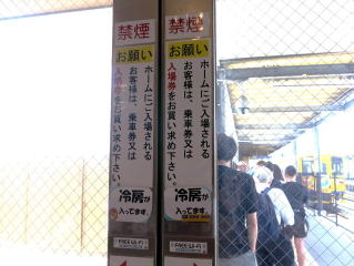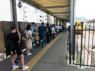 無改札のようですが、入場のみの場合は入場券が必要です。 | ワンマン列車なので、ホームよりもホームへの通路に列車待ちの列が出来ます。 | |||||||||||||||||||||