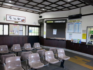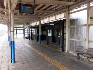 | 駅舎内。券売機が1台ありますが、JRと北越急行はもちろんえちごトキめき鉄道券も購入できます。窓口は時間限定の営業です。 | 駅舎ホーム側。大きな上屋がかかり、一部待合ベンチが置かれます。駅トイレもここにあります。 | |||||||||||||||||||