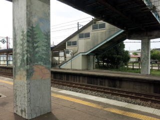 | ホームは2面3線。1・3番を信越本線の上下、2番を北越急行の列車が使用します。 | 跨線橋はカギ型で、コンクリート製の支柱です。随分褪せてしまいましたが森の画が描かれています。 | |||||||||||||||||||