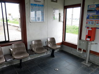 | この駅舎を側面から見るとこんな感じ。 | 駅舎内。簡易駅舎で広くはなく、4連のベンチが一つ置かれます。 | ||||||||||||||||