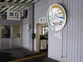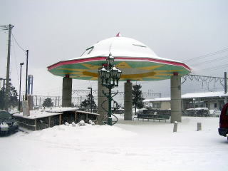 | 駅前に大きく派手な塗装の円盤があります。一応駅前の公園の東屋です。 | 駅内の様子。待合スペースがこの左手にありますが、特に区画されていません。 | |||||||||||||||||||
