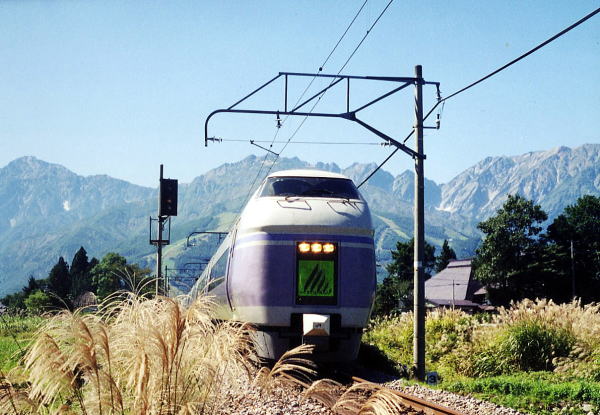 大糸線の代表ポイントとも言える、白馬岳など北アルプス背後の田園地帯。標準レンズでもこれだけ大きく山が入ります。もっとサイドに引いた構図が定番ですが、この日は手前のススキなど雑草が多すぎて、ススキを手前に入れて寄った構図としました。